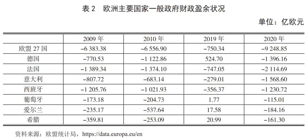 欧洲多数国家的一般政府赤字在2009年和2010年达到最高峰。2010年欧盟27国一般财政盈余达到阶段性最低值(赤字最大)。欧债危机爆发后,欧洲各国开始削减预算,一般性政府赤字显著收敛。俄乌冲突爆发之前,欧洲各国为了对抗新冠肺炎疫情,再度增加财政支出。2020年欧盟整体及几乎所有国家的财政状况都较2019年大幅恶化,个别国家的情形较2009—2010年时有过之而无不及(见表2)。作为欧盟国家中经济体量最大的两个国家,德国和法国2020年一般政府财政赤字远超欧债危机时期。现在那些当年处于欧债危机暴风眼的国家总体状况好于危机时,但意大利财政状况则较欧债危机时明显恶化。