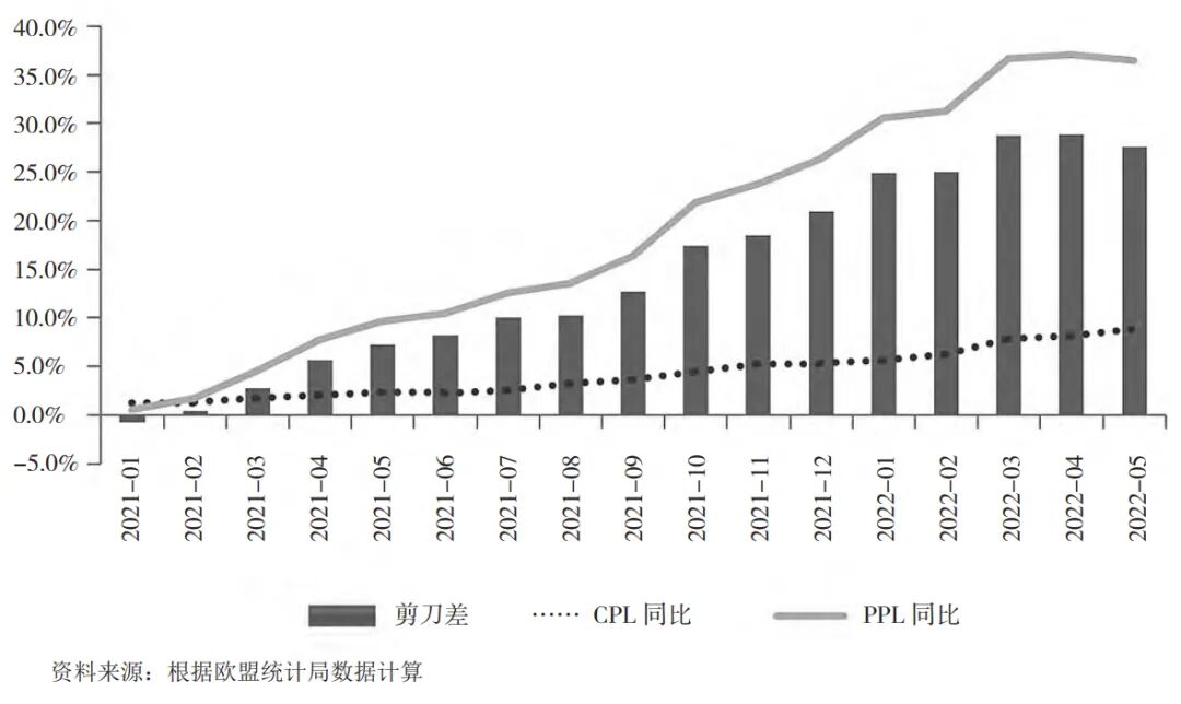 从欧洲生产企业角度看,生产者物价指数(PPI)与CPI之间的剪刀差呈现出不断扩大的态势(见图1)。这说明,对欧洲生产企业而言,来自上游原料的压力(PPI)难以转嫁给消费者(CPI),这对制造业企业的利润构成极大压力。另一方面,欧洲居民的绝对收入却暂时没有呈现出显著下降的特征。2022年5月欧元区失业率为6.6%,1月份则为6.9%。并且显著低于2021年的平均水平。从工资收入角度看,欧洲国家的用工成本继续呈现上涨态势。2022年第一季度,欧盟国家每小时劳动成本指数同比上涨3.7%,德国上涨4.5%。从企业角度看,上游成本抬升和用工成本抬升将给企业生产经营带来极大压力。