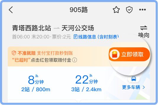 作为更精准的公交出行助手,“车来了”的准时保功能也为市民能够准点乘车增加了一层保障。预测不准时立即赔付1-5元,您可安心“掐点”乘车。