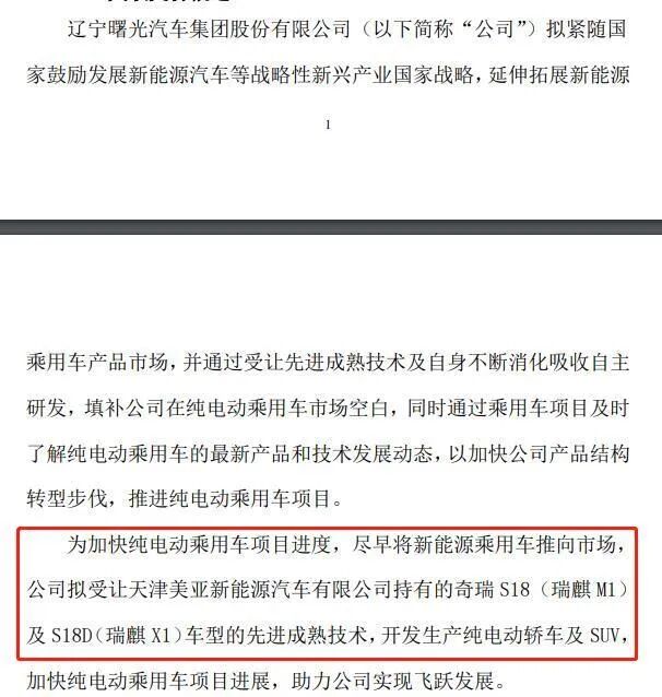 2021年9月,ST曙光宣布拟出资1.32亿元从控股股东华泰汽车全资子公司天津美亚新能源汽车有限公司手中收购奇瑞S18(瑞麒M1)及S18D(瑞麒X1)两个车型的无动力车身资产,正式拉开其进军纯电动乘用车市场序幕。