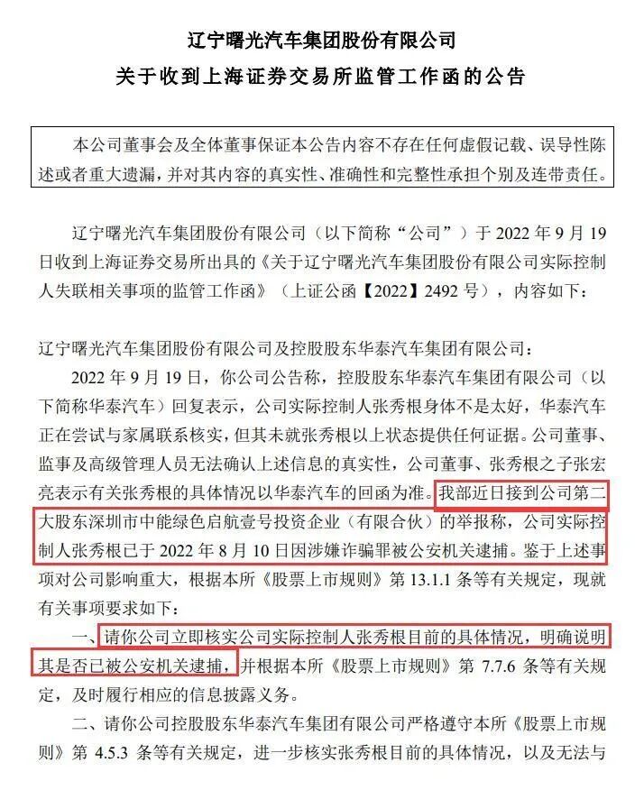 不过,就在华泰汽车首次回函的同日(9月19日),ST曙光再次收到上交所监管工作函。该监管工作函显示,上交所于近日接到ST曙光第二大股东深圳市中能绿色启航壹号投资企业(有限合伙)(以下简称深圳中能)的举报称,ST曙光实控人张秀根已于8月10日因涉嫌诈骗罪被公安机关逮捕。上交所要求ST曙光立即核实张秀根目前的具体情况,明确说明其是否已被公安机关逮捕,及时履行相应的信息披露义务。