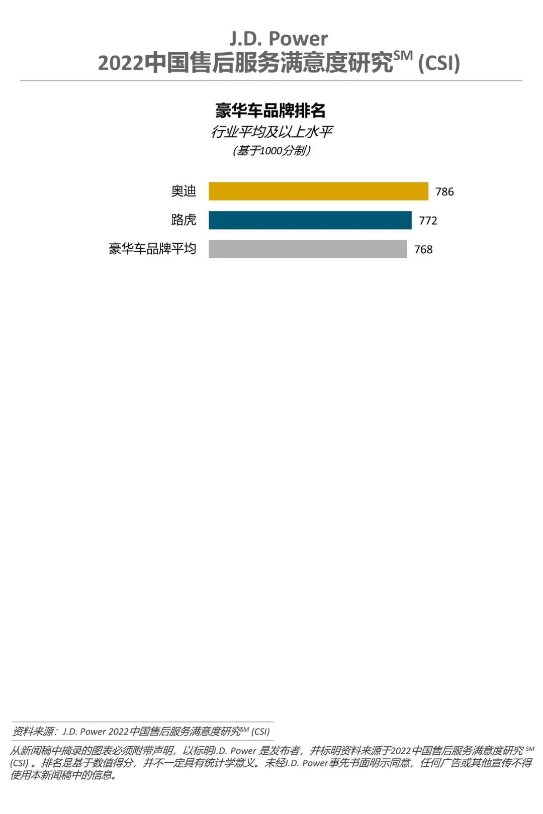 公开资料显示,J.D. Power中国售后服务满意度研究(CSI)评测的是拥车期为13至48个月的车主对过去12个月内在品牌授权经销店的服务经历的满意度,得分采用1000分制。