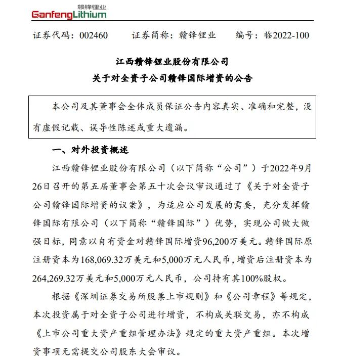 9月27日晚间,赣锋锂业(SZ002460,股价75.02元,市值1513亿元)披露两项增资事项。其中,一项为增资全资子公司赣锋国际9.62亿美元(约合人民币68亿元),另一项拟对江西领能锂业有限公司(以下简称领能锂业)增资3亿元。