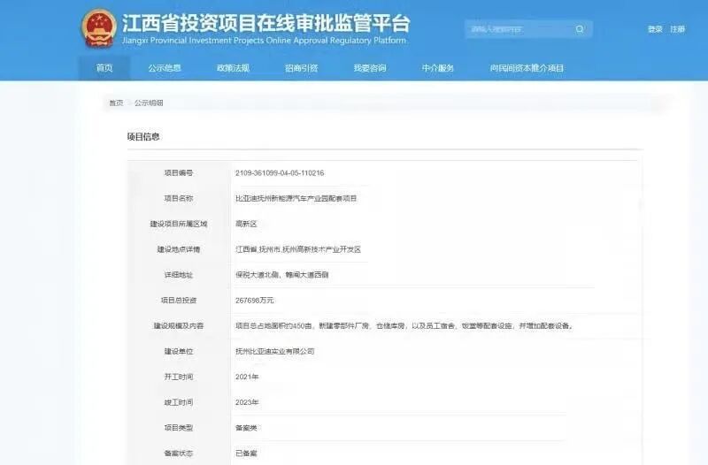 记者查阅江西省投资项目在线审批监管平台发现,比亚迪抚州新能源汽车产业园配套项目总投资约26.77亿元,项目总面积约450亩,新建零部件厂房、仓储库房,以及员工宿舍、饭堂等配套设施,并增加配套设备,计划于2021年开工,2023年竣工。