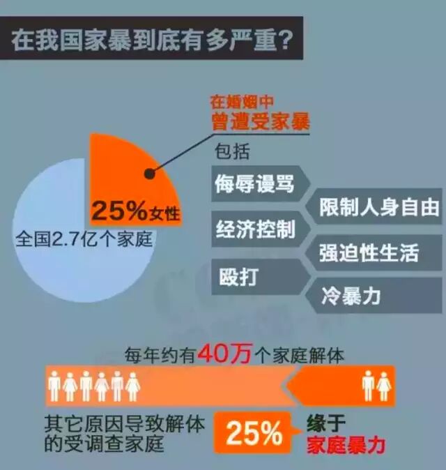 据调查,我国有四分之一的女性在婚姻生活曾遭受过家暴。我国每年约有40万个家庭解体,而这当中25%缘于家庭暴力。