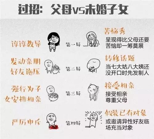 进攻就是最好的防守,不等亲戚提问,主动发起“攻击”。比如可以问亲戚“女儿谈朋友了吗?儿子在哪儿复读?给孩子备婚房没?血压血脂血糖正常吗?换新车摇号摇上了吗?”估计多问几个,亲友就已经昏过去了,也不在乎你婚不婚、生不生了。