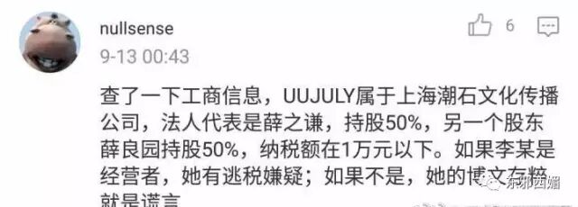 第二,李雨桐昨晚的博文中写UUJULY是她和薛之谦合开,各占50%股份。但根据工商信息查询结果,UUJULY属于上海潮石文化传播公司。这家公司薛之谦和他爸各占50%股份,股东名单里根本没有李雨桐的名字。