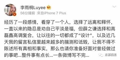 她的留言似乎证明了李雨桐确实是薛的前女友