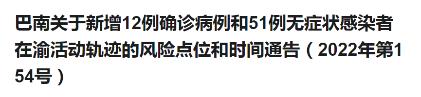 重庆市巴南区新型冠状病毒肺炎疫情防控指挥部发布关于新增12例确诊病例和51例无症状感染者在渝活动轨迹的风险点位和时间通告(2022年第154号)。