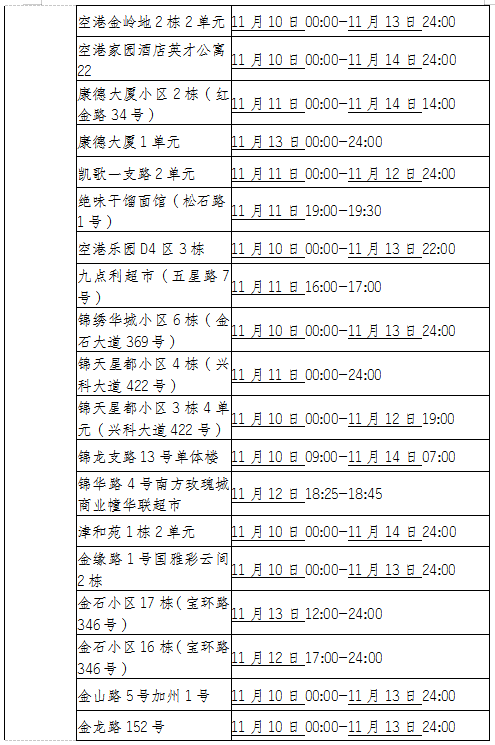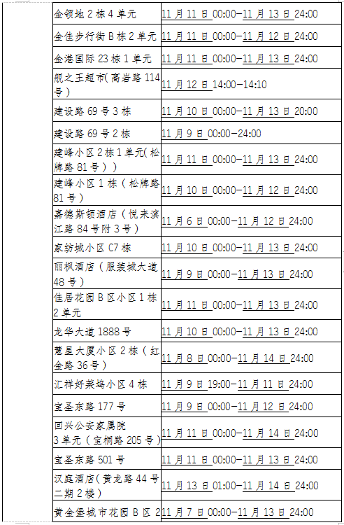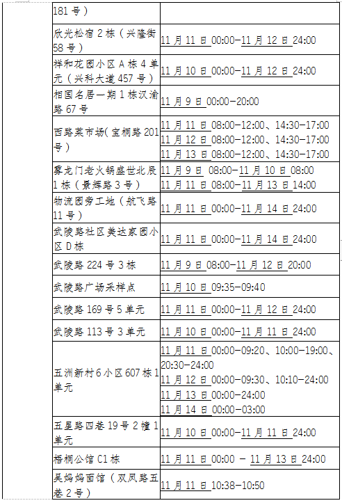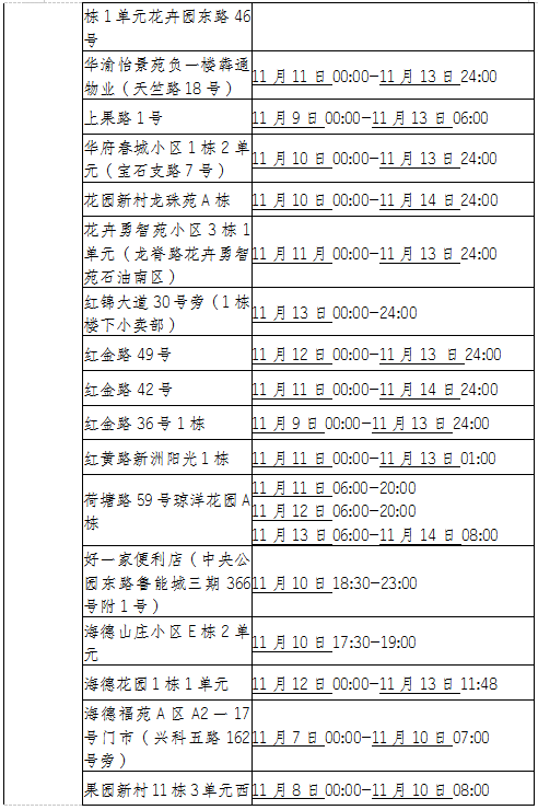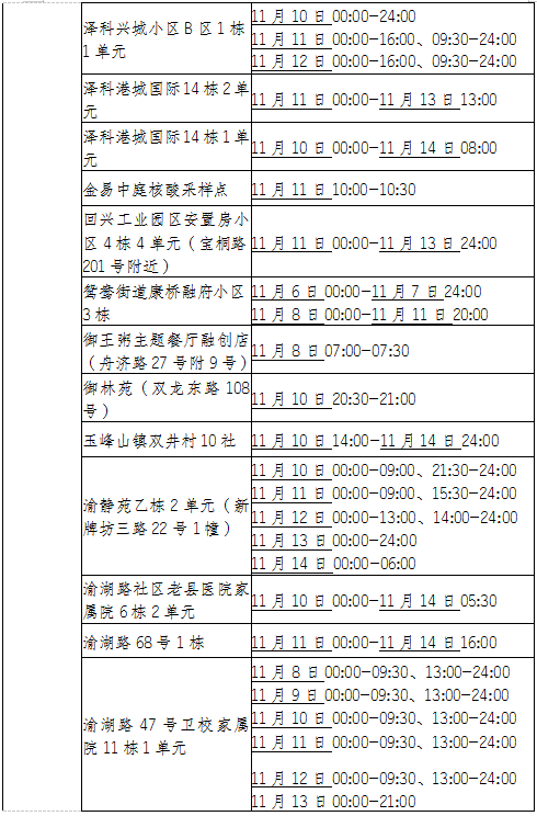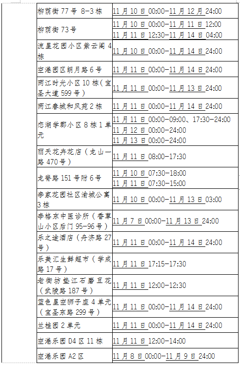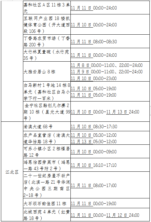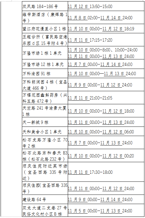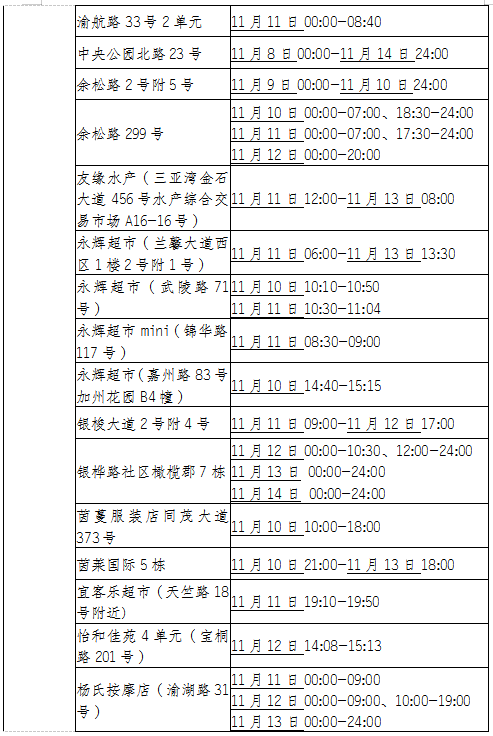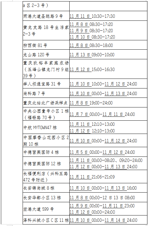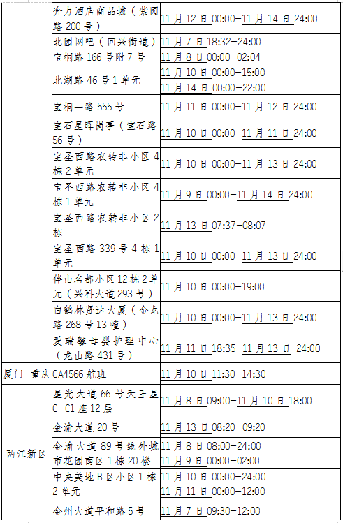 2022年11月14日,渝北区新增报告1例确诊病例(确诊病例1)和380例无症状感染者(无症状感染者1-380)。现将在渝主要活动轨迹的风险点位和时间通告如下: