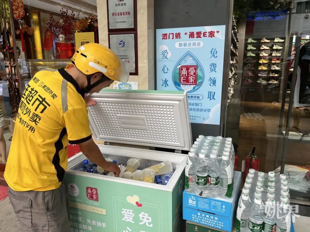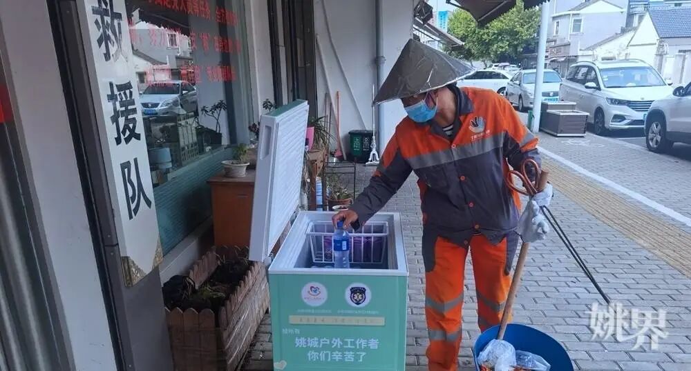“给所有姚城户外工作者,你们辛苦了。”这几天,梁弄镇横坎头村如意路的红村救援队门口多了一台写有这样字样的薄荷绿小冰箱,里面装有供户外工作者免费自取的矿泉水和棒冰,也准备有冰镇八宝粥。不时有路过的环卫工人、交警、快递小哥打开柜门,获取一份清凉。
