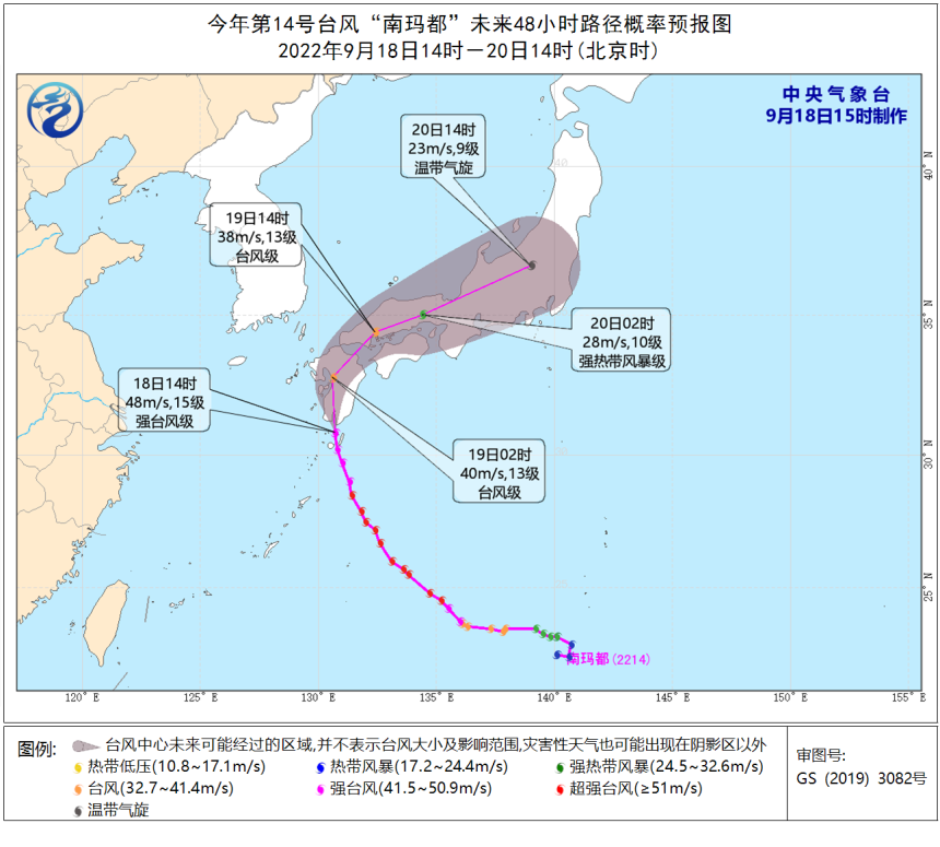 今年第14号台风“南玛都”于今天(18日)凌晨从超强台风级降为强台风级,其中心今天14时距离日本九州岛偏南方向约245公里,就是北纬30.8度、东经130.7度,中心附近最大风力15级(48米/秒),中心最低气压930百帕。