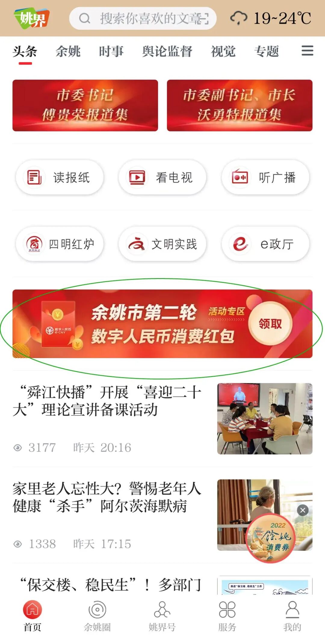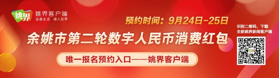 本次“数币活动”红包预约时间为9月24日至9月25日全天。全体在姚人员均可通过姚界客户端(5.0.0以上版本)“余姚市数字人民币消费红包活动专区”报名预约。