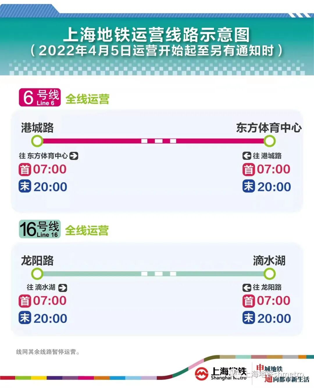 除上海地铁6号线、16号线提供缩时运营服务外,网络其他所有线路车站均暂停运营。缩时运营期间,线路起讫站双向首末班车时间均为7点和20点。同时,途经车站发车时间根据列车运行图顺延,提请乘客注意。