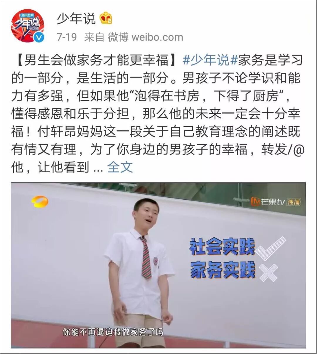 周末在家看《少年说》,看到一个姓付的男孩走上天台,向妈妈呼喊:“我不想再做家务了!”