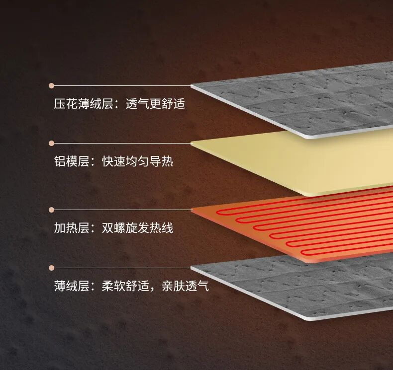 内部通过热传导形成循环暖流,毯子发热很均匀,随你怎么翻身,都这么暖。