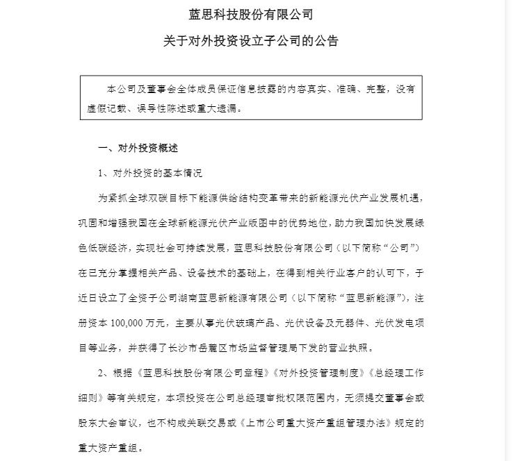 公告显示,蓝思科技于近日设立了全资子公司湖南蓝思新能源有限公司(以下简称“蓝思新能源”),注册资本100,000万元,主要从事光伏玻璃产品、光伏设备及元器件、光伏发电项目等业务,并获得了长沙市岳麓区市场监督管理局下发的营业执照。