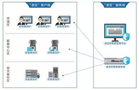 如图所示:诺亚防勒索系统分为后台管理中心和前端代理,后台管理中心部署在该医院数据中心的服务器上,设置固定IP地址,保证能与终端客户端联网访问;在被保护业务服务器上部署诺亚防勒索系统前端代理客户端。