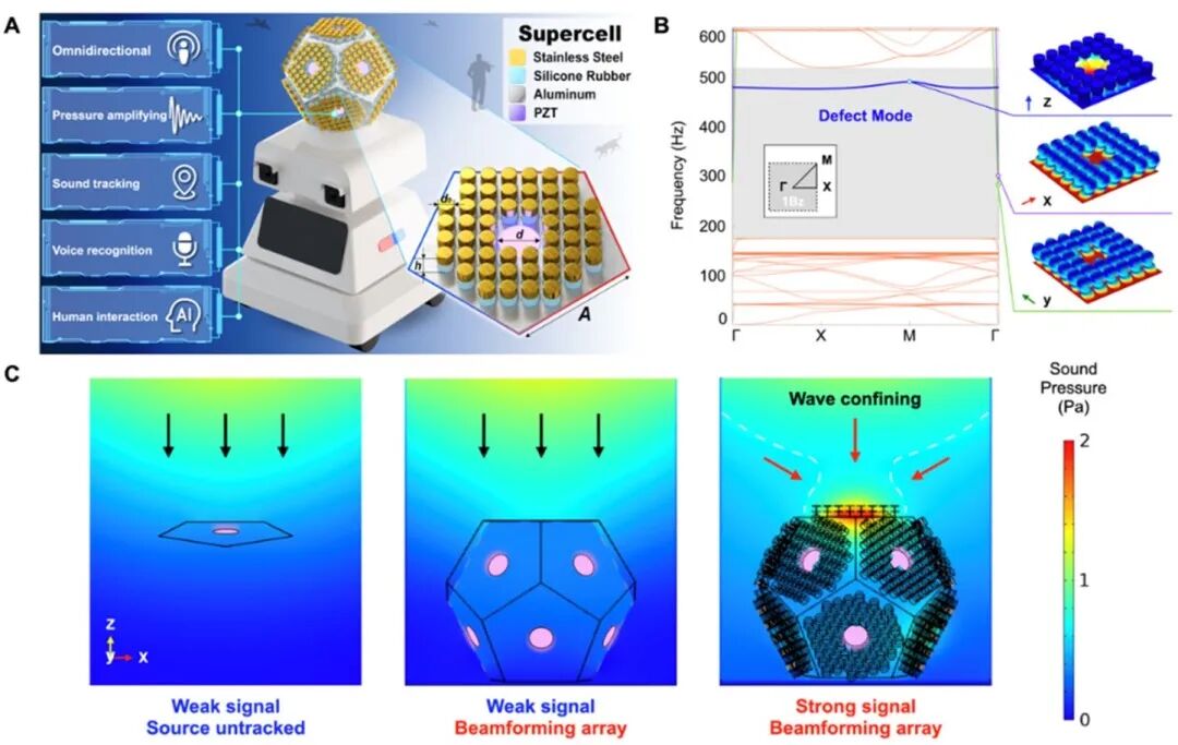 近日,上海交通大学密西根学院教师邵磊及合作团队在国际知名学术期刊《Science Advances》上发表题为“A wave-confining metasphere beamforming acoustic sensor for superior human-machine voice interaction”(超球面波束成形声音传感器实现卓越人机语音交互)的最新科研成果论文。研究团队率先设计出一种声学超球面声音传感器,展示了全向拾音、声压放大、声源追踪、高性能音频克隆和语音识别等多项功能,即使在强背景噪声环境中也能定位和识别相邻角度的声源,从而实现了卓越的人机声交互性能。