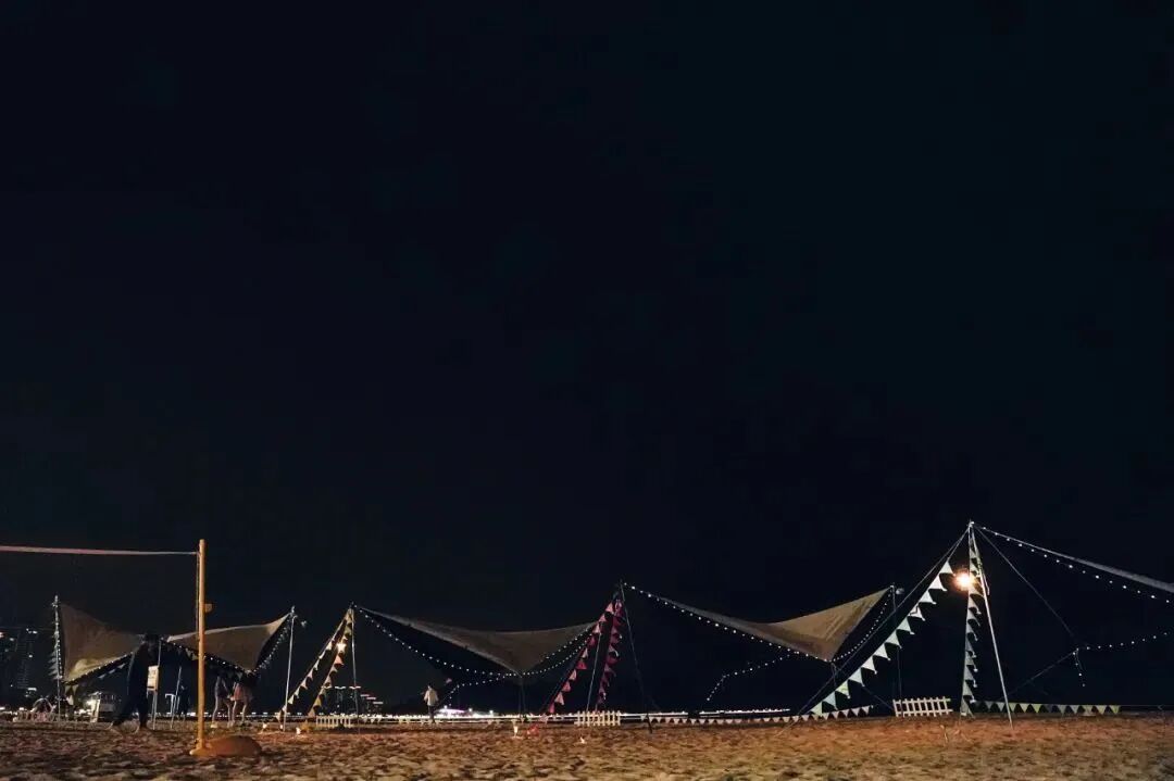 再往海边走,是一个电影主题的酒吧露营地,老板既有情调,也有生意头脑。沙滩上摆着几顶缠绕彩灯的天幕,横梁上挂着风铃,海风一吹叮咚作响,煞是好听。