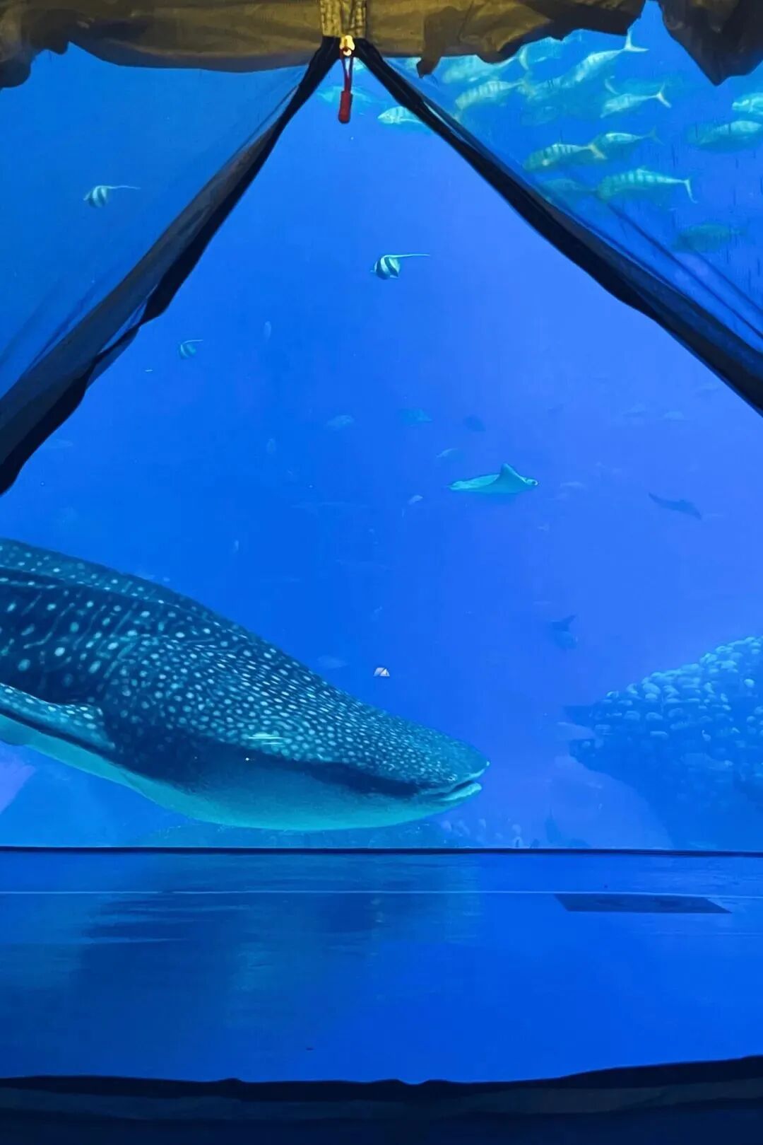 闭园后的珠海长隆海洋王国逐渐关掉了所有室外照明,鲸鲨馆内安静而空旷,在深蓝色的海底搭起帐篷,看鲸鲨和鱼群从头顶游过,是日常生活里从未感受过的奇妙和梦幻。