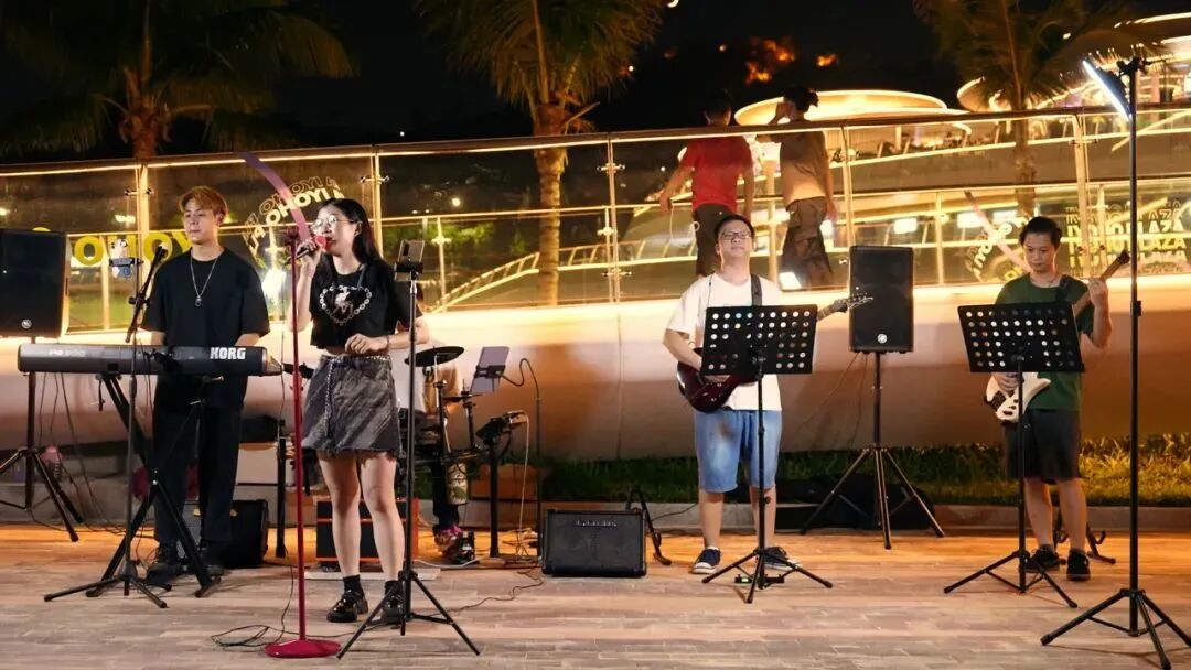 在日落后的蓝调时刻,天空和海洋呈现出了一样的色彩。从灯塔走回海滩,一路上有几个乐队在演出,不需要声光电的舞台简单而动人,昏黄的灯光下,是别样的浪漫。