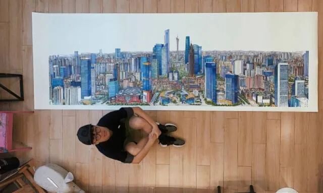 2020年,他开始为广州的城市新面貌作画,最终创作出后来为人所熟知的《广州·珠江新城》。“一开始的难点在于选景,我跑过大大小小的高楼,只为了选一个能体现出广州繁华和特色的点,通过几个月的摸爬,最后才确定了目前所呈现的视觉画面,我采用了自己画画以来最大的画幅——画卷3.4米长,断断续续画了半年,于2021年完成。”