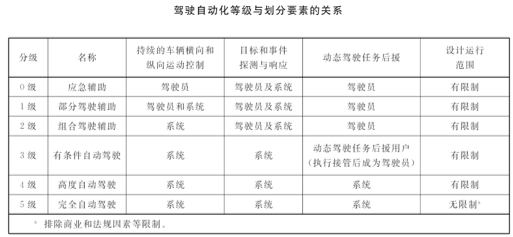 根据《汽车驾驶自动化分级》国家推荐标准(GB/T40429-2021),驾驶自动化系统可划分为6个等级: