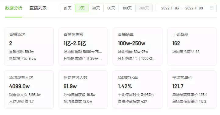 但张庆杨的带货数据确实优秀,据飞瓜数据,截至11月9日,张庆杨近三个月共进行了29场直播,直播销量1000-2500万。近三个月GMV达10-25亿,场均销量5000-7500万,和爆红的东方甄选近三个月的数据不相上下。