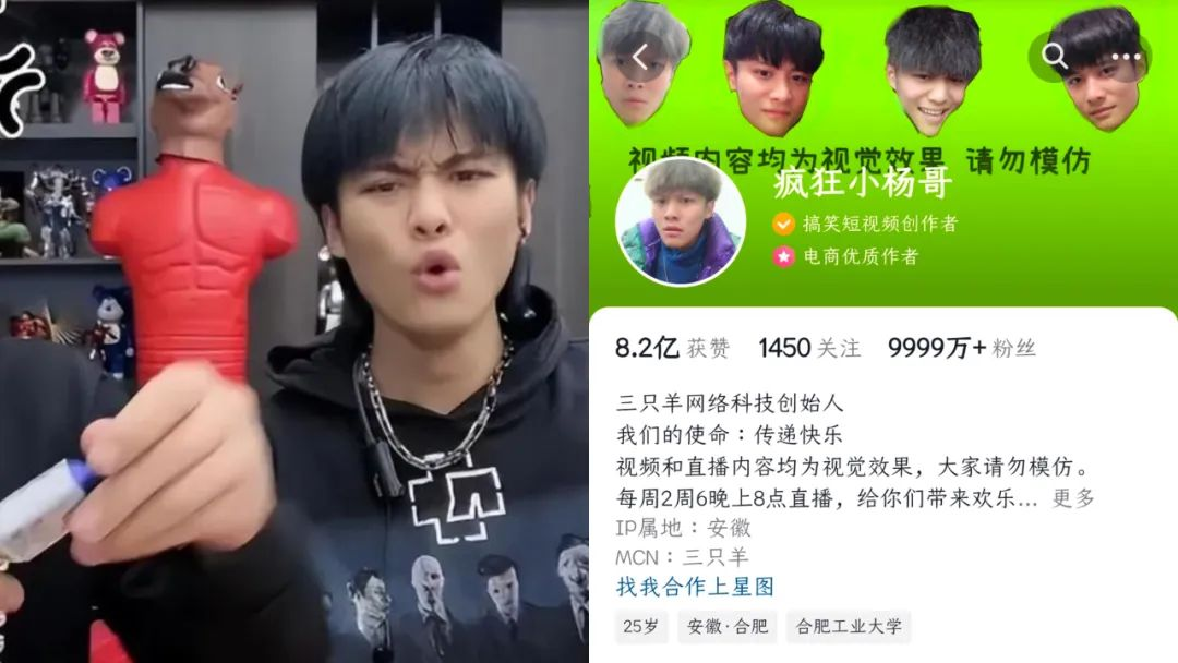 “疯狂小杨哥”,原名张庆杨,1995年出生于安徽,目前在抖音平台作品获赞数量达8.3亿。