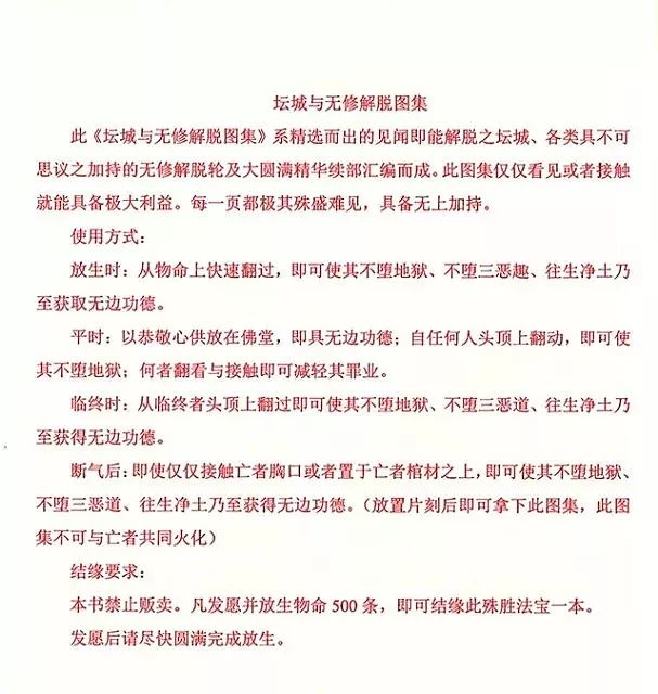 断气后:即使仅仅接触亡者胸口或者置于亡者棺材之上,即可使其不堕地狱、不堕三恶道、往生净土乃至获得无边功德。(放置片刻后即可拿下此图集,此图集不可与亡者共同火化)