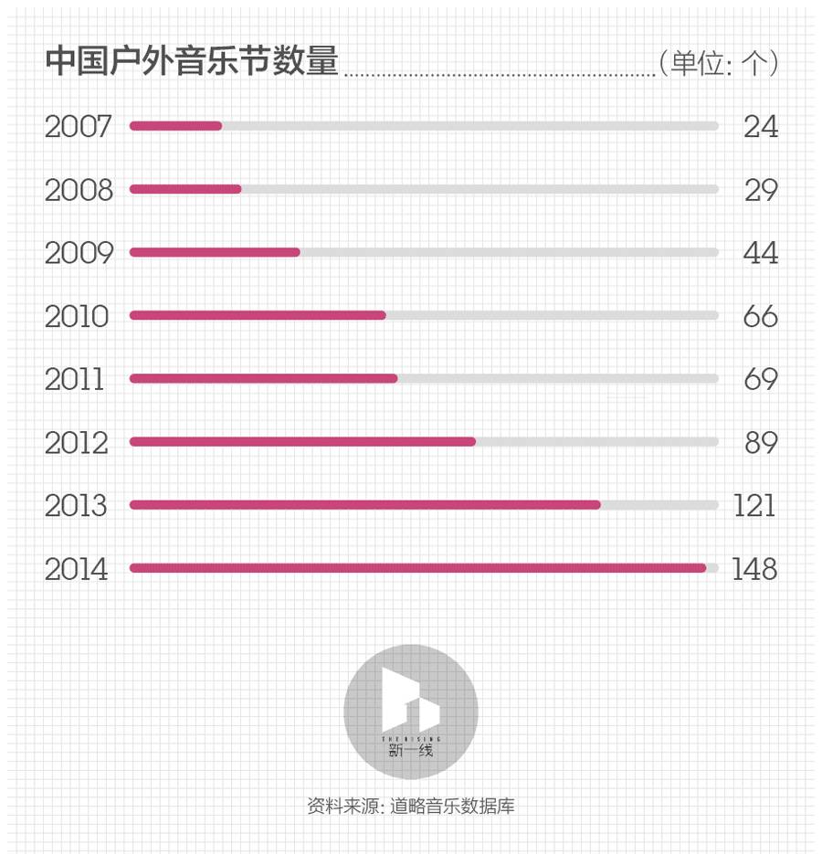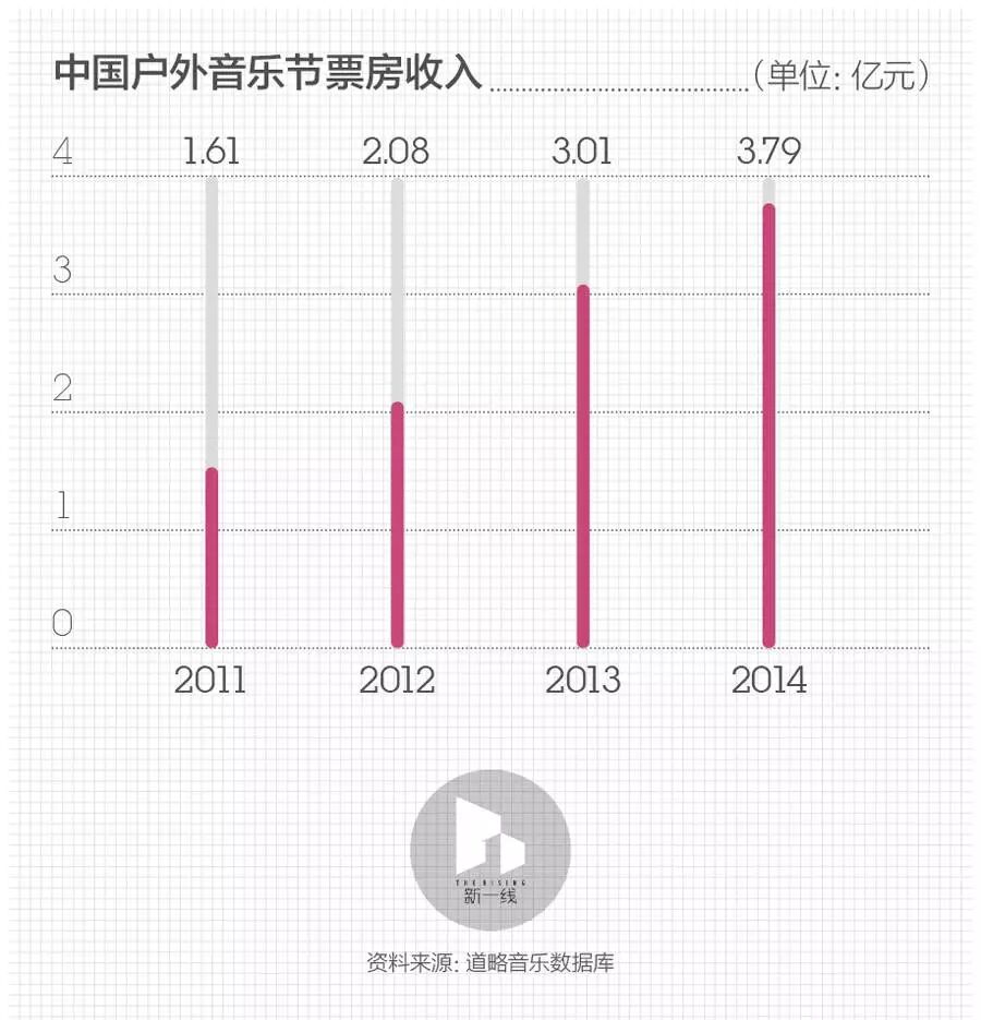 但天花板也逐渐显现。进入2014年,音乐节无论在数量还是在票房方面增速都明显放缓了,根据道略音乐产业研究中心的统计,中国户外音乐节票房收入增速从2013年的44.7%降低到2014年的23.7%2015年则很可能出现下降。2014年之所以能保持增长,70%都是由草莓音乐节的扩张带来的。