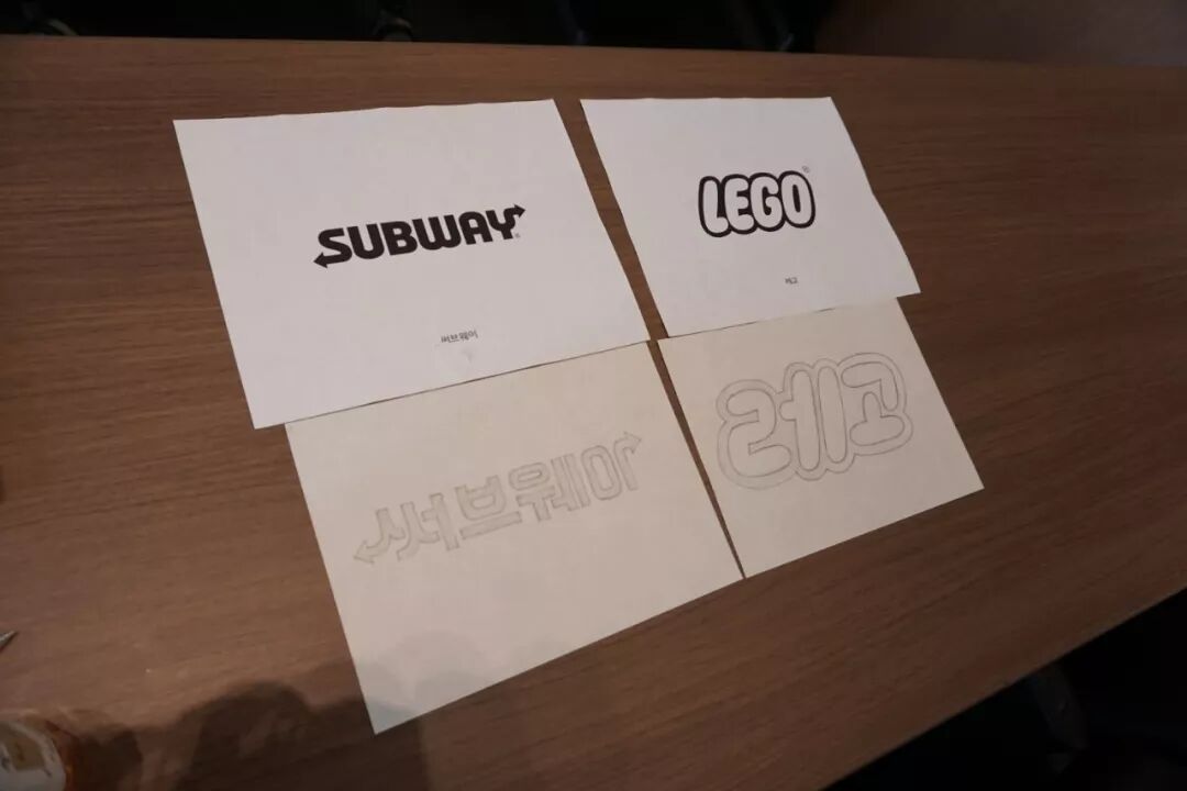 — 上午的小作业:根据著名品牌的英文标识,定制符合其风格的韩文标识。对于非母语者来说,手绘过程中浮现了许多细节问题,比如「这样写会不会太奇怪」「这个笔画是否认得出来」等等,也是在培养对文字的感觉。