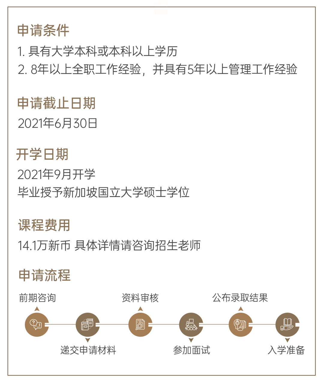 2021年新加坡国立大学中文EMBA硕士学位课程申请现在已经向全球开放,欢迎希望提升管理水平、开拓国际化视野的企业家和管理者加入新加坡国立大学中文EMBA。我们采用全年招生、滚动录取方式,建议您尽早提交资料。
