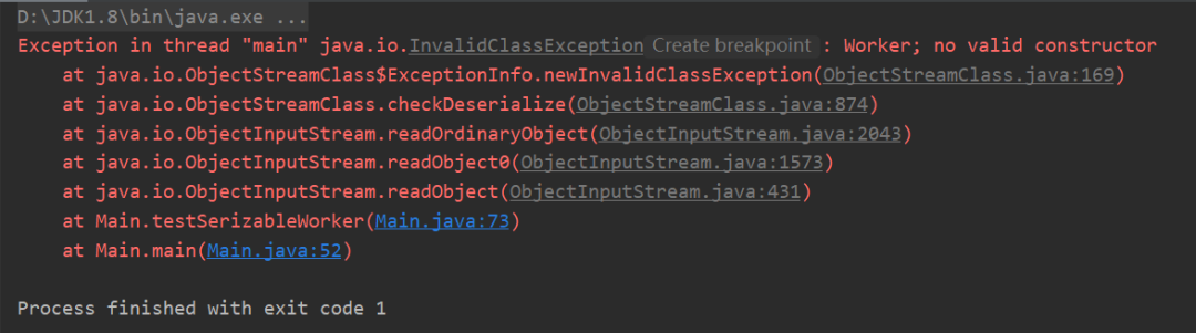 结果显示没有有效地构造器,原来是因为父类没有序列化的时候,Object newWorker = ois.readObject()需要直接调用父类的无参数构造方法,不经过子类的无参构造方法。