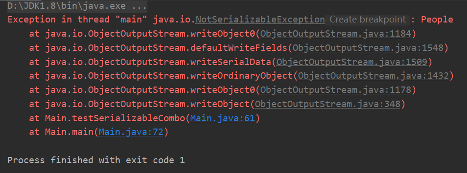 来一个组合对象,里面引用People对象,此时People对象没有实现Serializable接口,能否序列化呢?代码给出来,大家可以自行复制测试一下。