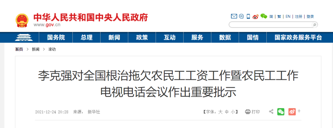 全国根治拖欠农民工工资工作暨农民工工作电视电话会议12月24日在京召开。中共中央政治局常委、国务院总理李克强作出重要批示。