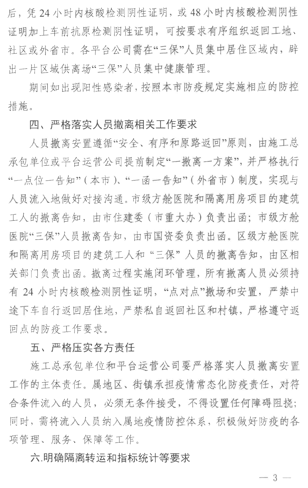 社区或外省市。各平台公司需在“三保”人员集中居住区域内,辟出一片区域供离场“三保”人员集中健康管理。