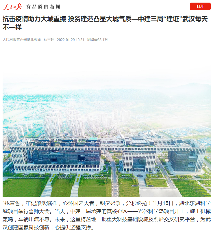 内容摘要:1月29日,《人民日报》客户端刊文《中建三局“建证”武汉每天不一样》,报道中建三局扎根湖北47年,始终与英雄的湖北人民、武汉人民心手相连,“十三五”期间在鄂累计完成投资1758亿元,2021年在鄂完成投资220亿元,为湖北“建成支点、走在前列、谱写新篇”,为武汉奋力打造新时代英雄城市贡献新的更大力量。