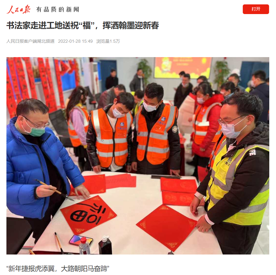 内容摘要:1月28日,《人民日报》客户端刊文《翰墨迎新 湖北省书法名家走进工地为工友送“福”、送春联,报道湖北省五位书法名家冒着严寒来到由中建三局总承包公司承建的武汉市中心医院杨春湖院区项目,摆开案台、挥毫泼墨,为春节值守岗位的工友们送“福”、送春联。