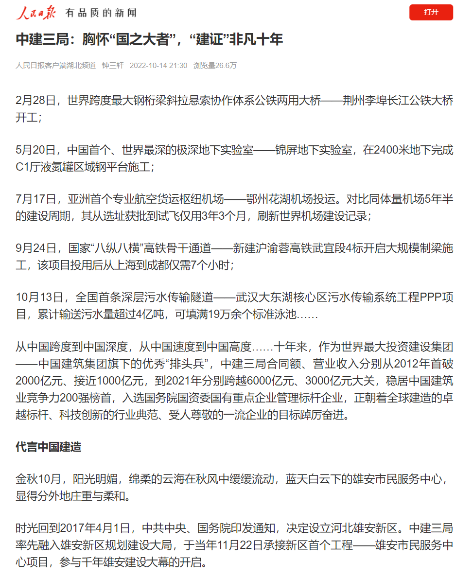 迈上“十四五”新征程,中建三局正在更加积极主动地融入党和国家事业战略全局,奋力建设“高质量万亿三局”,致力成为最具价值创造力的世界一流投资建设集团,为国家经济社会建设、拓展人民群众幸福空间、推动行业高质量发展贡献新的更大力量。