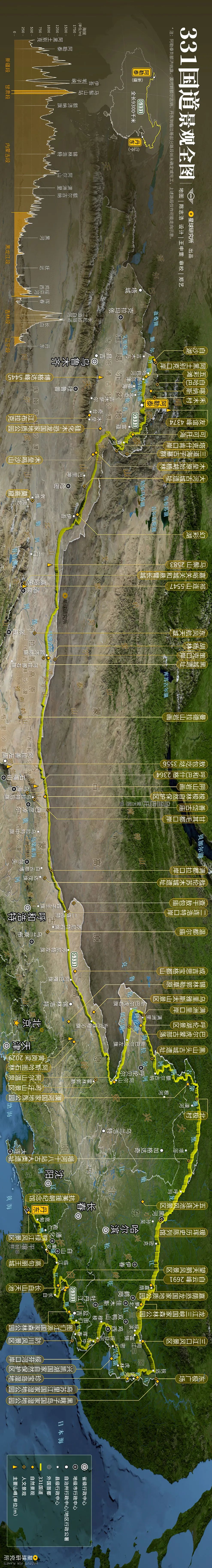 (331国道为目前中国第二长国道;请横屏观看,331国道景观全图,制图@陈志浩&王申雯/星球研究所)