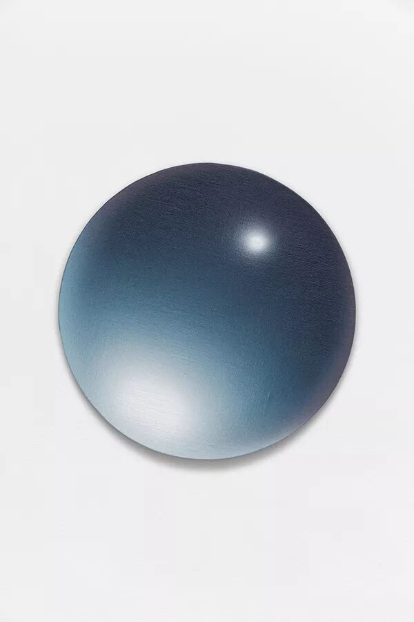 在“蒸发之前的时刻” 系列中,一排形状整齐的圆形绘画并排悬挂在绘有类似大理石纹路的大尺幅纸本上。每个圆形的颜色有细微的差别,看上去如同巨型的水滴。在灰黑色大理石纹的衬托下,它们像潺潺流水中凝结的晶莹冰珠,温柔,平静,有力。每个圆形向一个汇聚高光的点渐变,那些光点似乎拥有奇异的魔力。