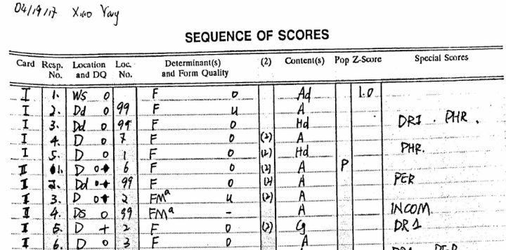 每一个微小的细节都是需要被记录和编码的重要数据。编码完成后,今天的医生会把代码一一输进罗夏的软件中(80年代以前都是手动查表),随后软件将生成一份10-20页的人格报告,报告内容涵盖自杀风险、压力管理、自我感知、抑郁、精神分裂、躁狂等十余个方面。
