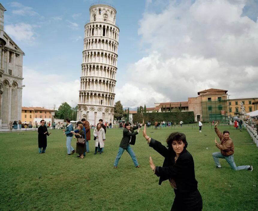 在摄影项目《小世界》里,马丁·帕尔让自己成为游客照的参与者,他拍摄那些正在拍旅游纪念照的人们:神庙前合拍的旅行团;围着比萨斜塔四周做推塔姿势的游客;金字塔前举着相机摄影的观光客。