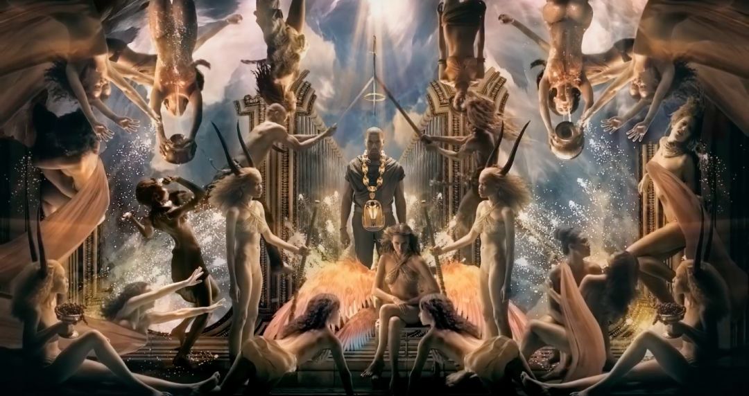 2010 年,Marco Brambilla 为当红嘻哈艺人 Kanye West 的单曲《POWER》打造了一分多钟的 MV 预告。在黑金为主色调的影像中,头悬达摩克利斯之剑的 Kanye West 身披金链,全程面无表情一言不发。伊西丝与哈索尔装扮的女神簇拥在他两侧,跃然空中的斗士缓慢地挥舞刀剑。