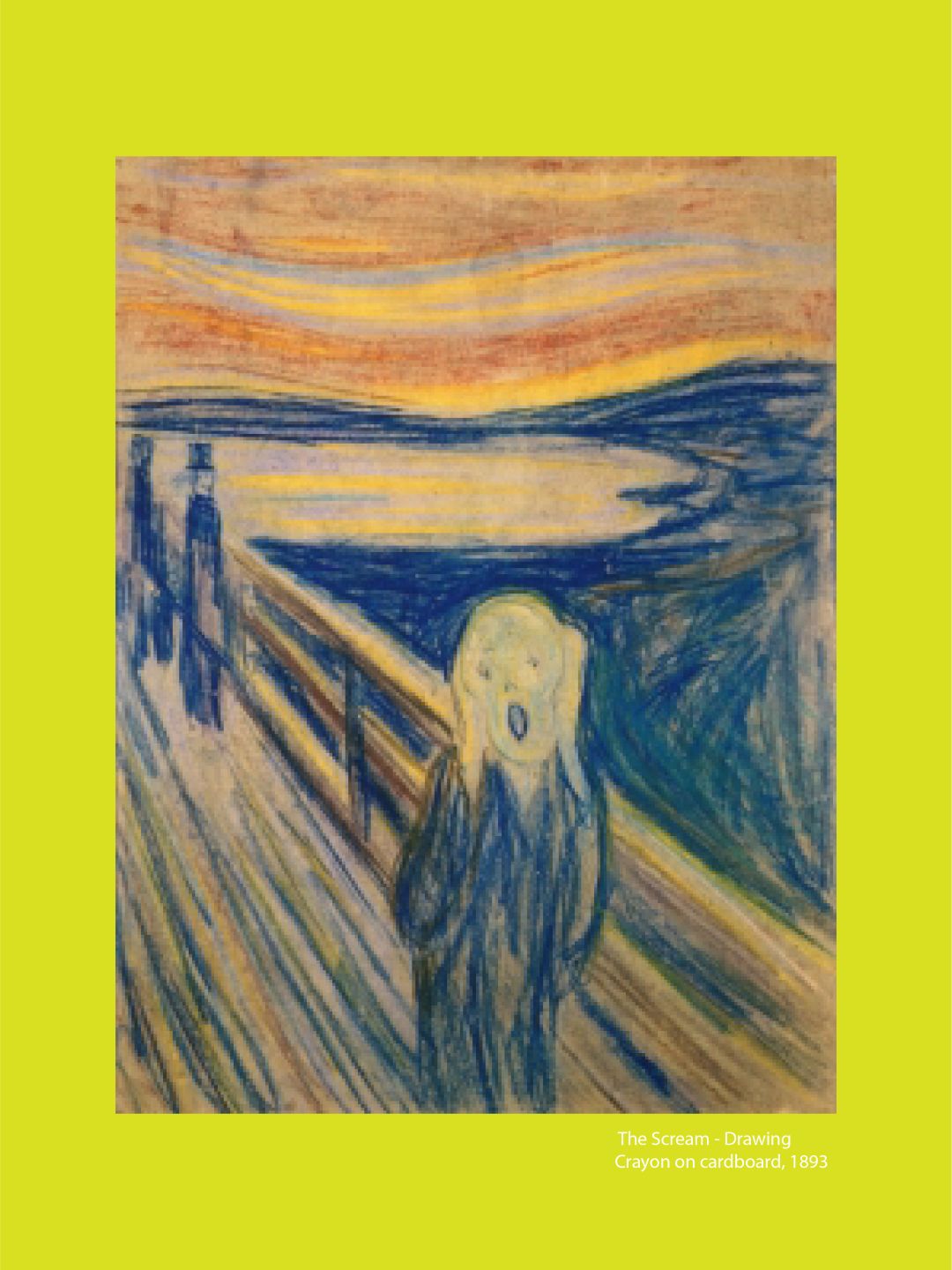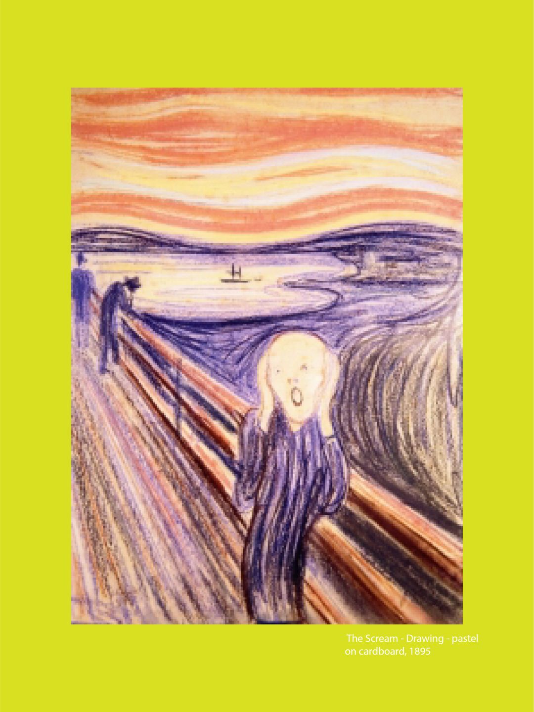 “我和两位友人正沿着小径走着——太阳正落山,天空瞬时变得血红——我因而感受到一种忧郁、一种内心深处极大的痛苦逼近了我。我停下来,精疲力尽地倚靠在栏杆上——火红的天空像熊熊火舌之血平躺在蓝黑色的峡湾与城市上空。朋友们接着走了——但我站在原地,恐慌地颤栗——此时,我感受到了来自自然那无尽的、剧烈的尖叫。”