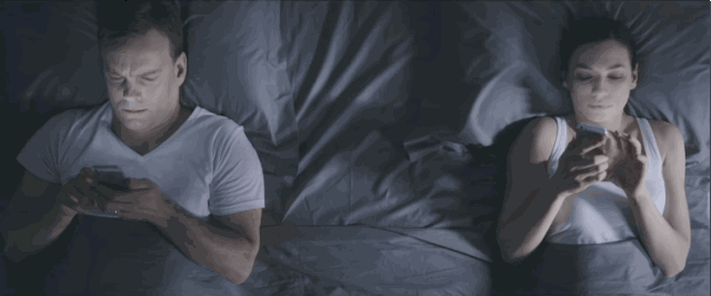 男女主人公在清晨睁眼后各自投入屏幕上的交流
