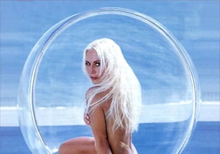 范思哲的设计师妹妹多纳泰拉·范思哲(Donatella Versace),1997年出现在了杂志《名利场》的内页里。这张照片由摄影师赫伯·瑞茨拍摄,图片中透明的球椅,仿佛漂浮在蓝色的泳池上的一颗肥皂泡。