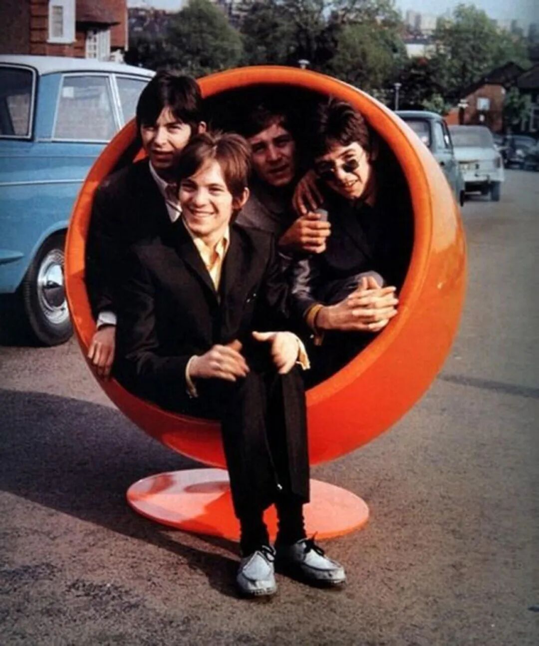 男乐手们也不例外。来自英国伦敦的小脸乐队(The Small Faces)为了拍一张宣传照,把四个人都塞到了椅子里。